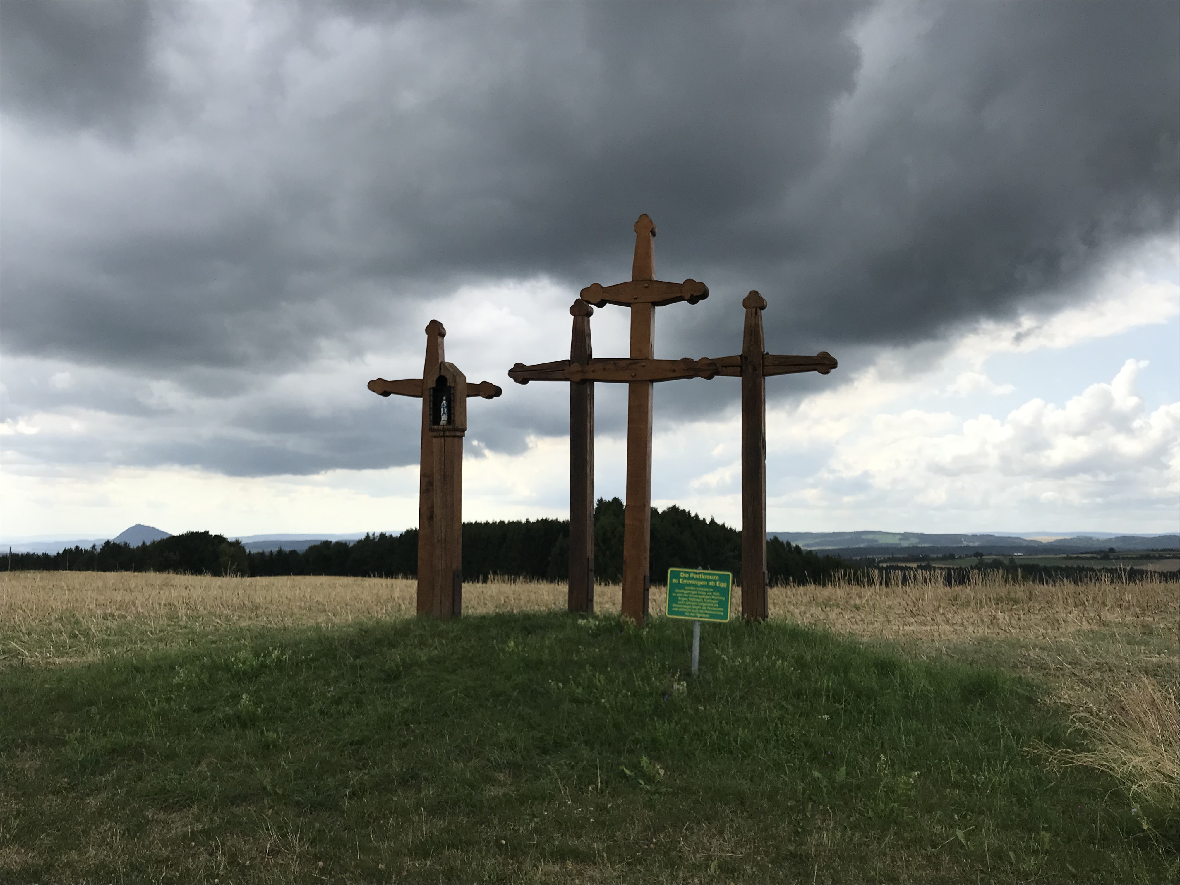 Tagsüber schien das Wetter immer wieder zu überlegen, was es tun sollte. Aufklaren oder heftig regnen. Als wir irgendwann passablen LTE-Empfang hatten, befragten wir unsere Wetter-Apps, doch die Vorhersagen waren nicht ganz eindeutig. In Eigeltingen – etwa auf der halben Strecke – stoppten wir am Dorflädchen und trafen bei der zweiten Cola unsere Entscheidung. Wir würden zelten; das vorsorglich reservierte Hotel in Tuttlingen stornierten wir.