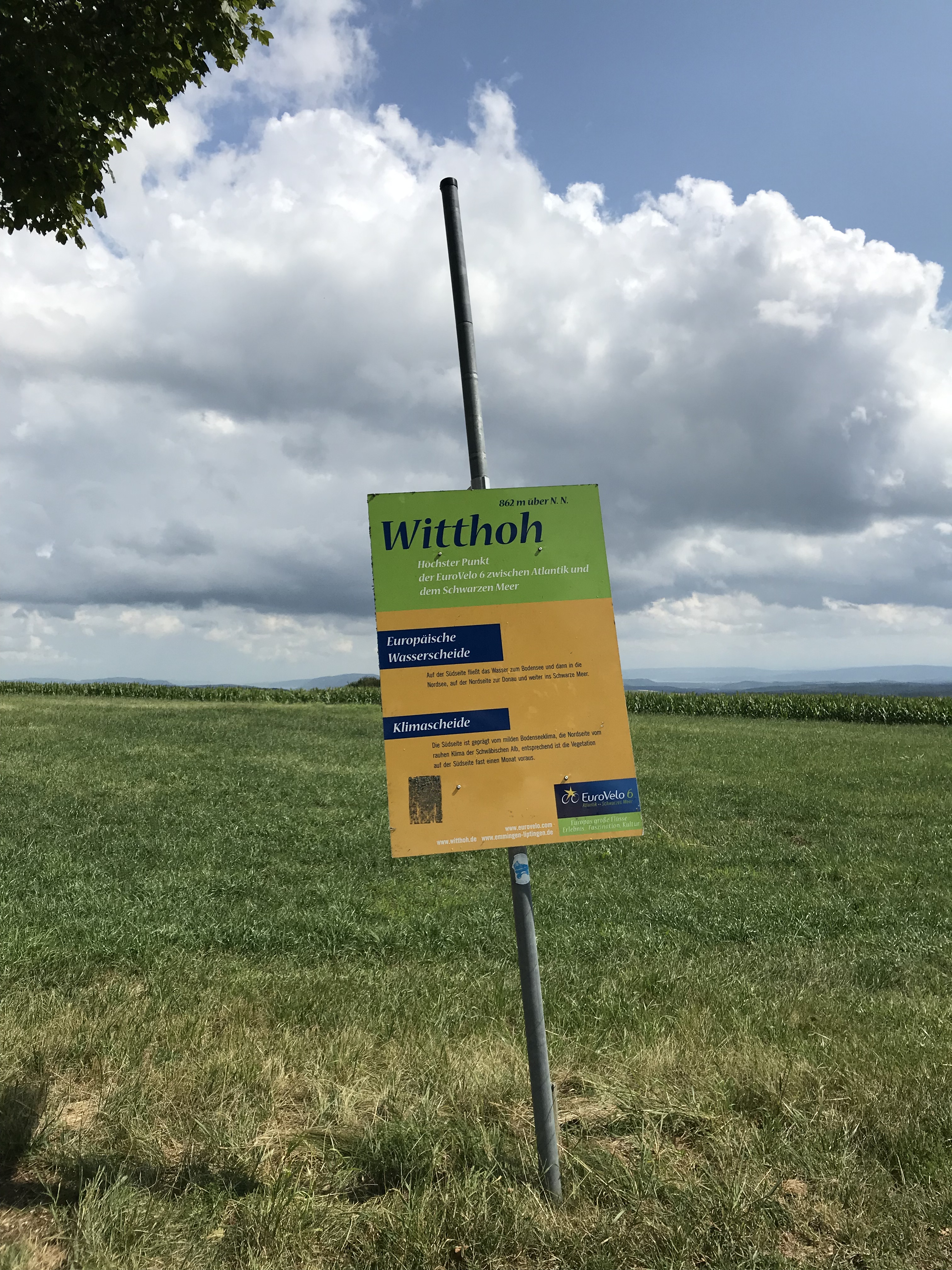 Nicht nur das Wetter forderte uns heute. Wenn man von Bodensee bis Tuttlingen hoch fährt, ist das inklusive einiger Höhenmeter. Es fing harmlos an, doch ab Tageskilometer 22 ging es stetig 13 km bergauf – bis Witthoh. Mit 862 Meter über N.N. ist das der höchste Punkt der Eurovelo 6 zwischen Atlantik und Schwarzem Meer. Es hat trotz der Plackerei Spaß gemacht: Straße fast verkehrsfrei und landschaftlich traumhaft schön. Die Steigungen sind so, dass man es auch mit dem bepackten Reiserad schafft. Nicht nur Vera, sondern auch ich.