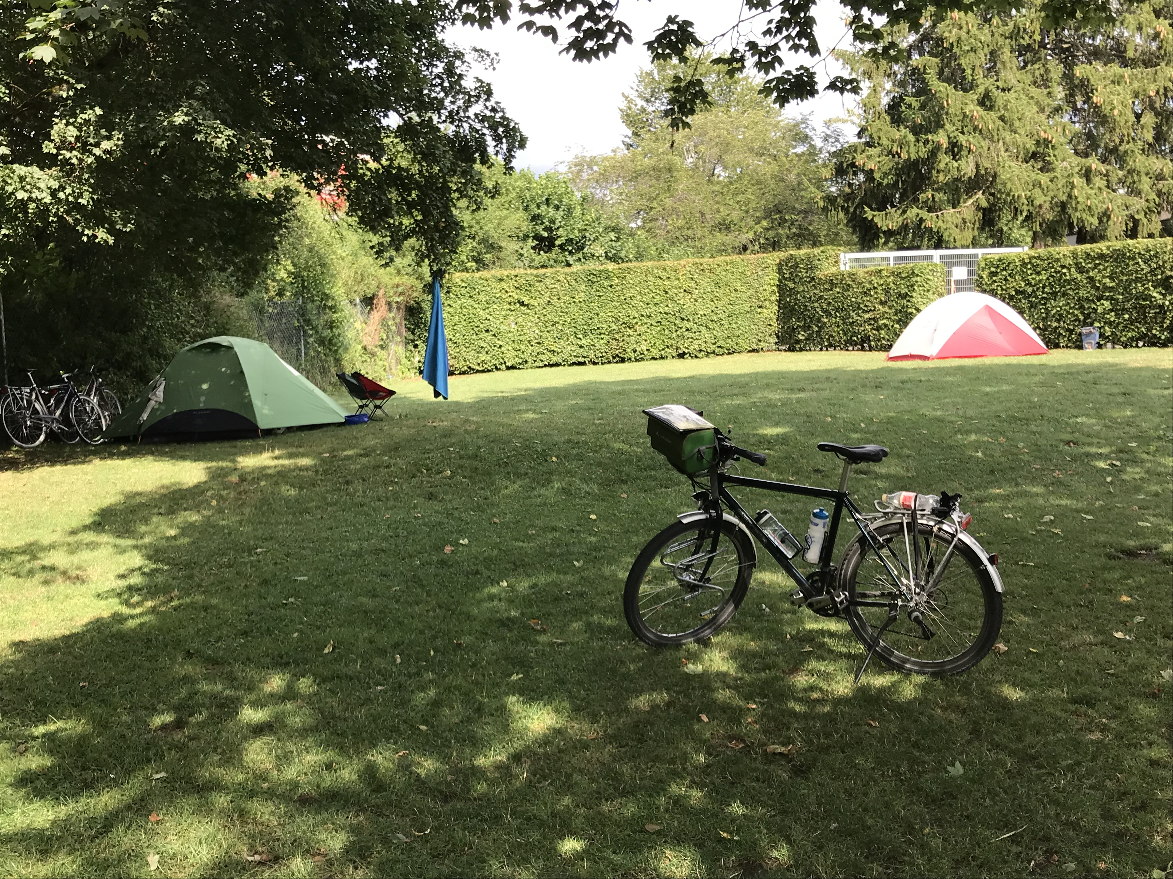 Ab Witthoh geht es bis auf kleine Zwischenhöhen bergab bis Tuttlingen. Dort steuerten wir den kostenlosen Radlerzeltplatz an. Lediglich für Duschen und nächtliche Toilettenbenutzung zahlt man einen Unkostenbeitrag von 5 EURO. Wer so günstig schläft, kann abends in die Stadt und beim Italiener schlemmen gehen.