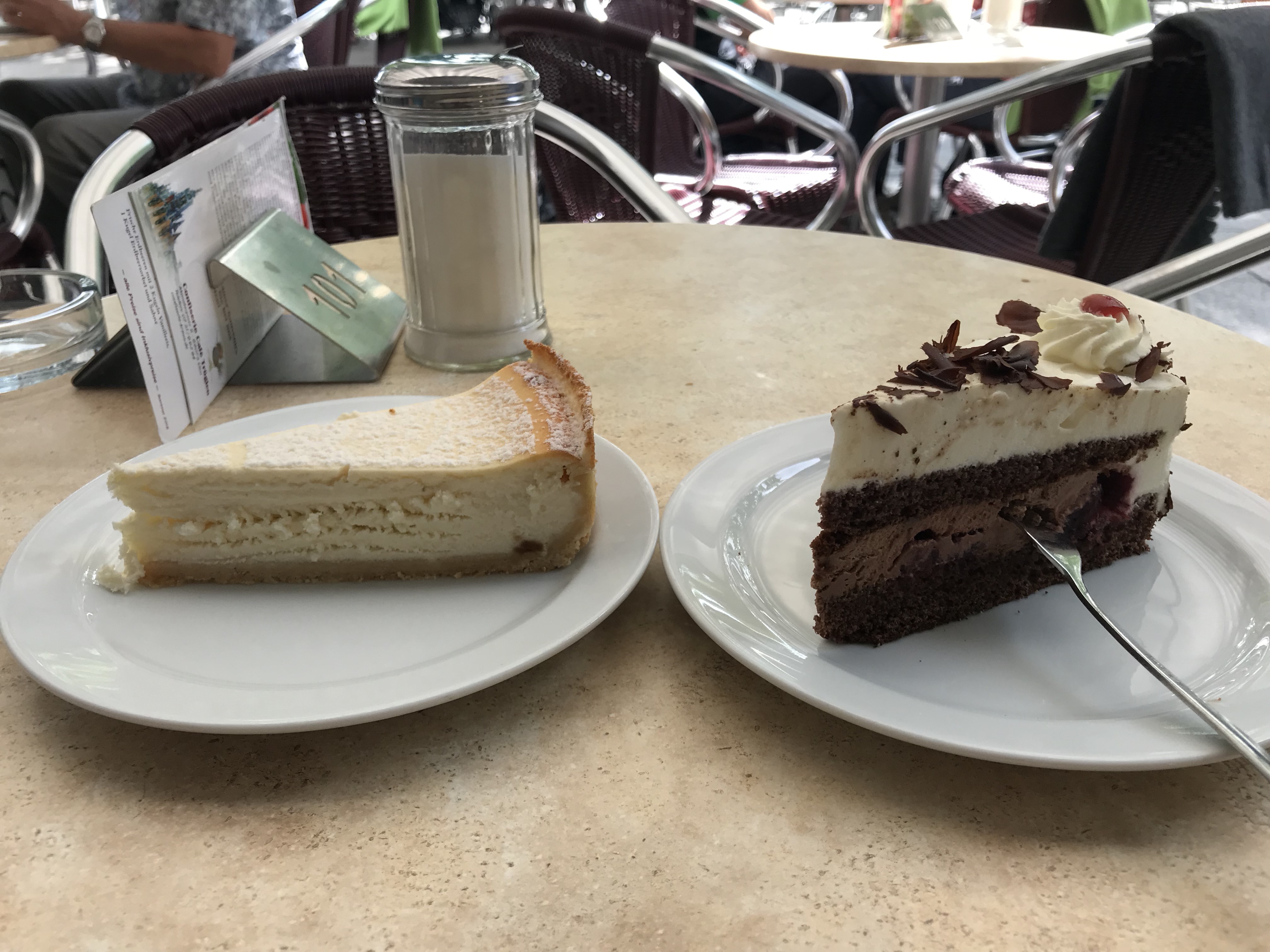 Schließlich endet die Tour mit Käsekuchen und Schwarzwälder Kirsch. Diese Stärkung ist auch gut, denn ab Ulm hat die Bahn ein wenig Probleme. Die Automatik der Tür im Fahrradwagen ist ausgefallen genauso wie die Klimaanlage. Nicht schön. Aber nichts, das uns die Reise verderben könnte.